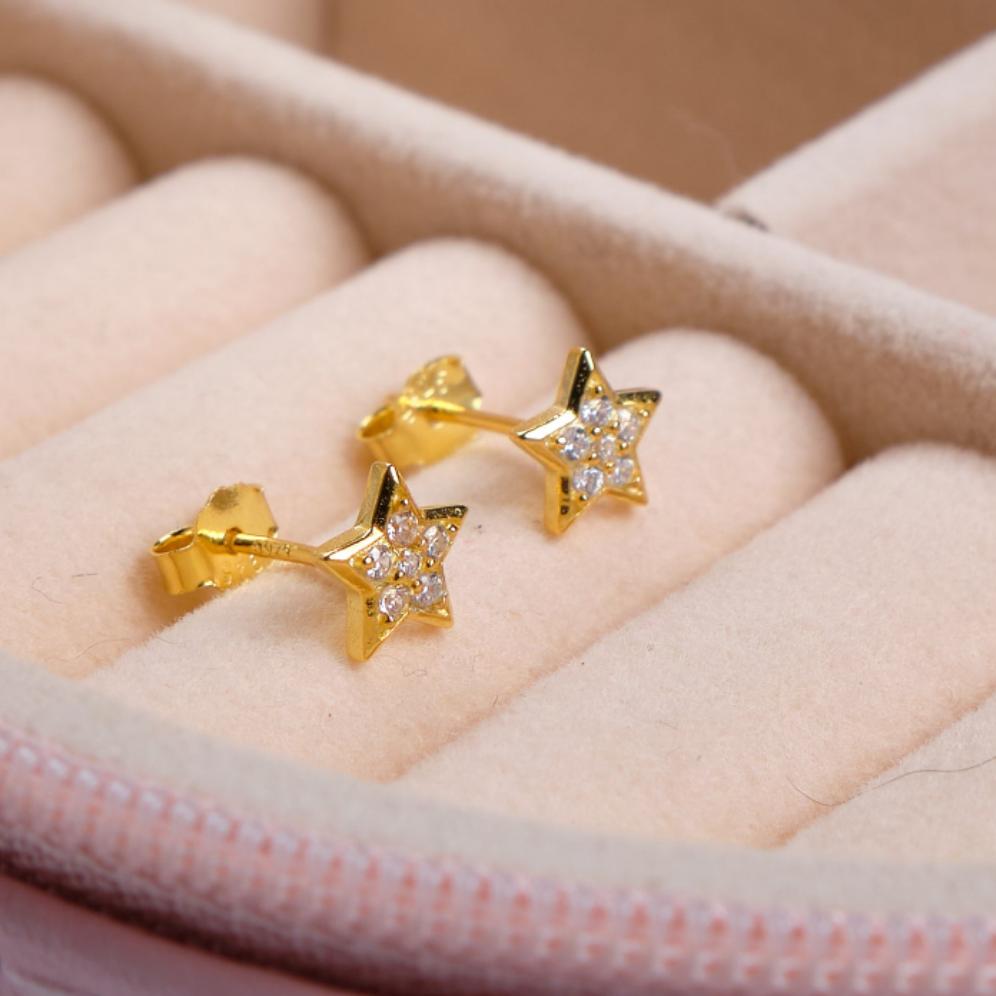 • Aretes en forma de estrella en plata, baño de oro y circonitas blancas.