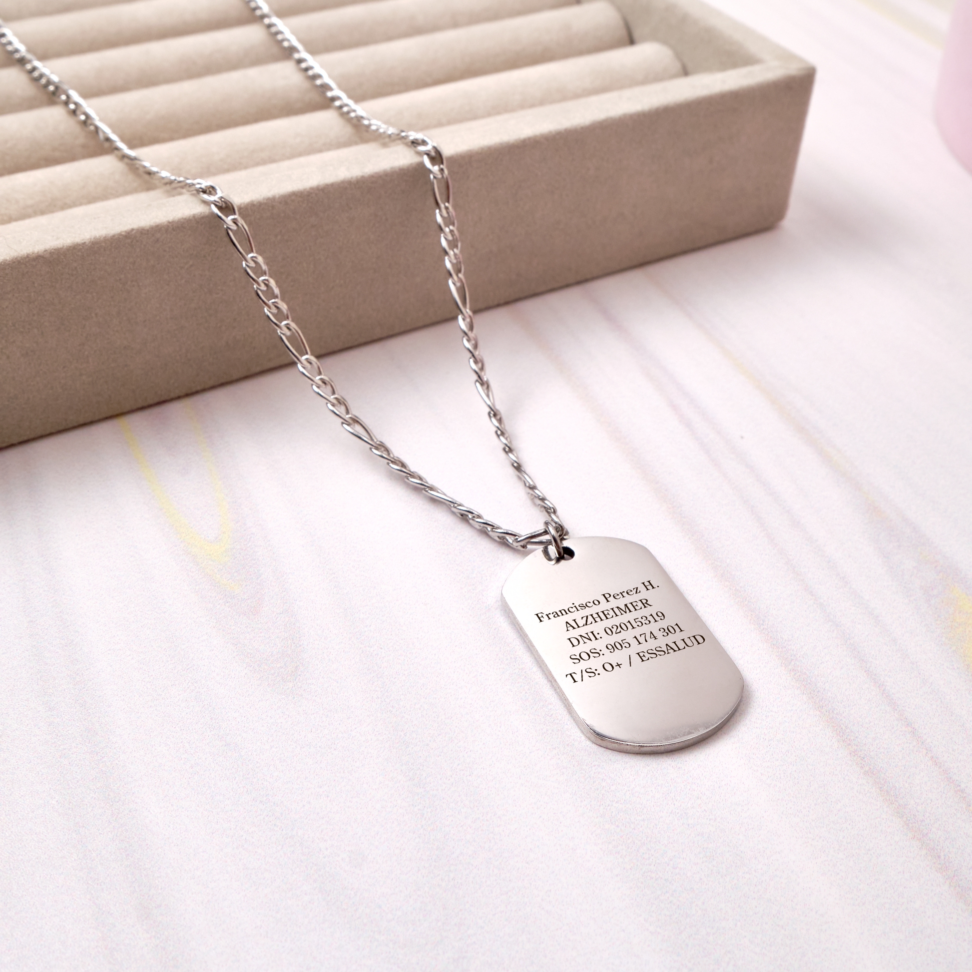 • Collar personalizable (incluye grabado láser de nombres, iniciales, datos médicos, frases, etc. por los dos lados de la placa)