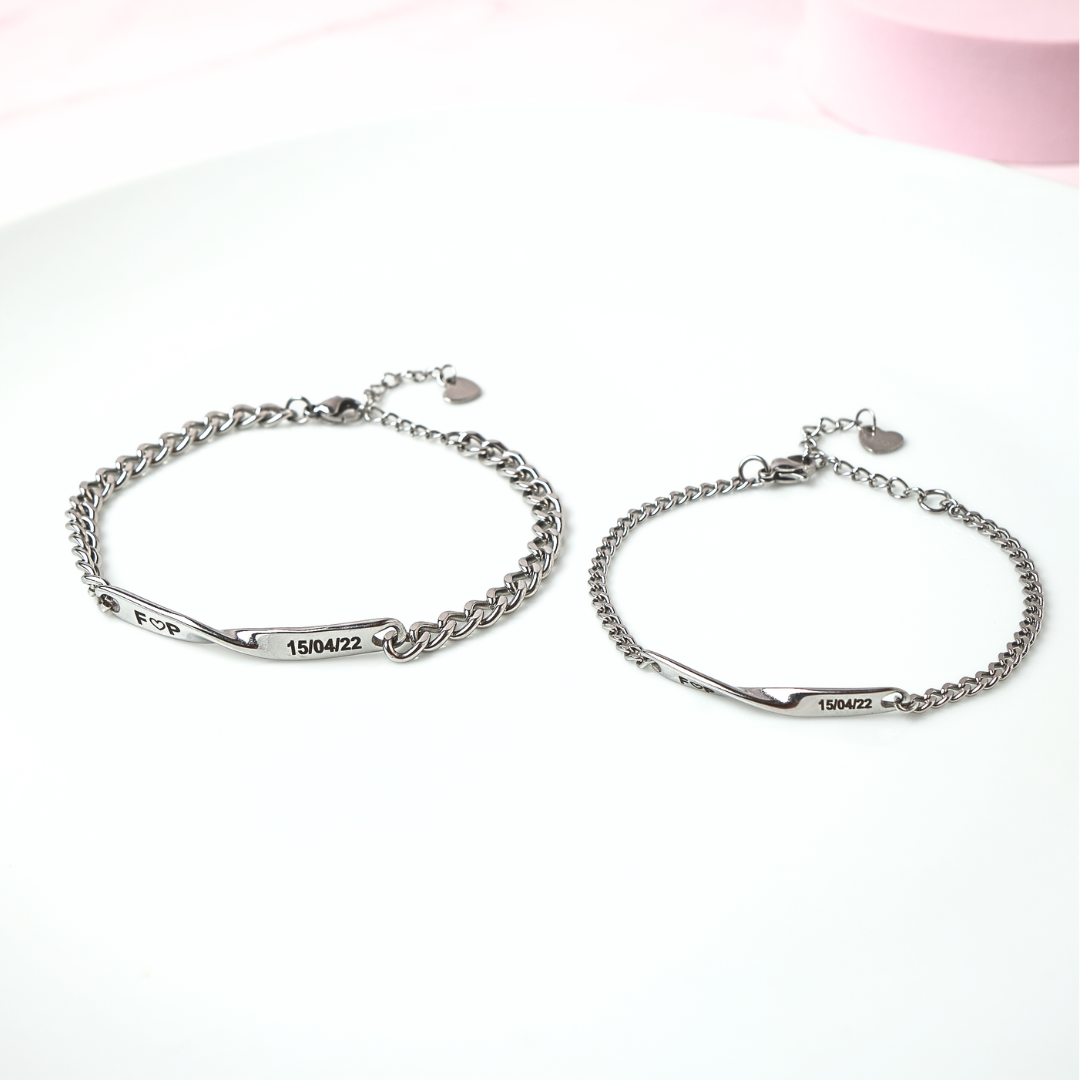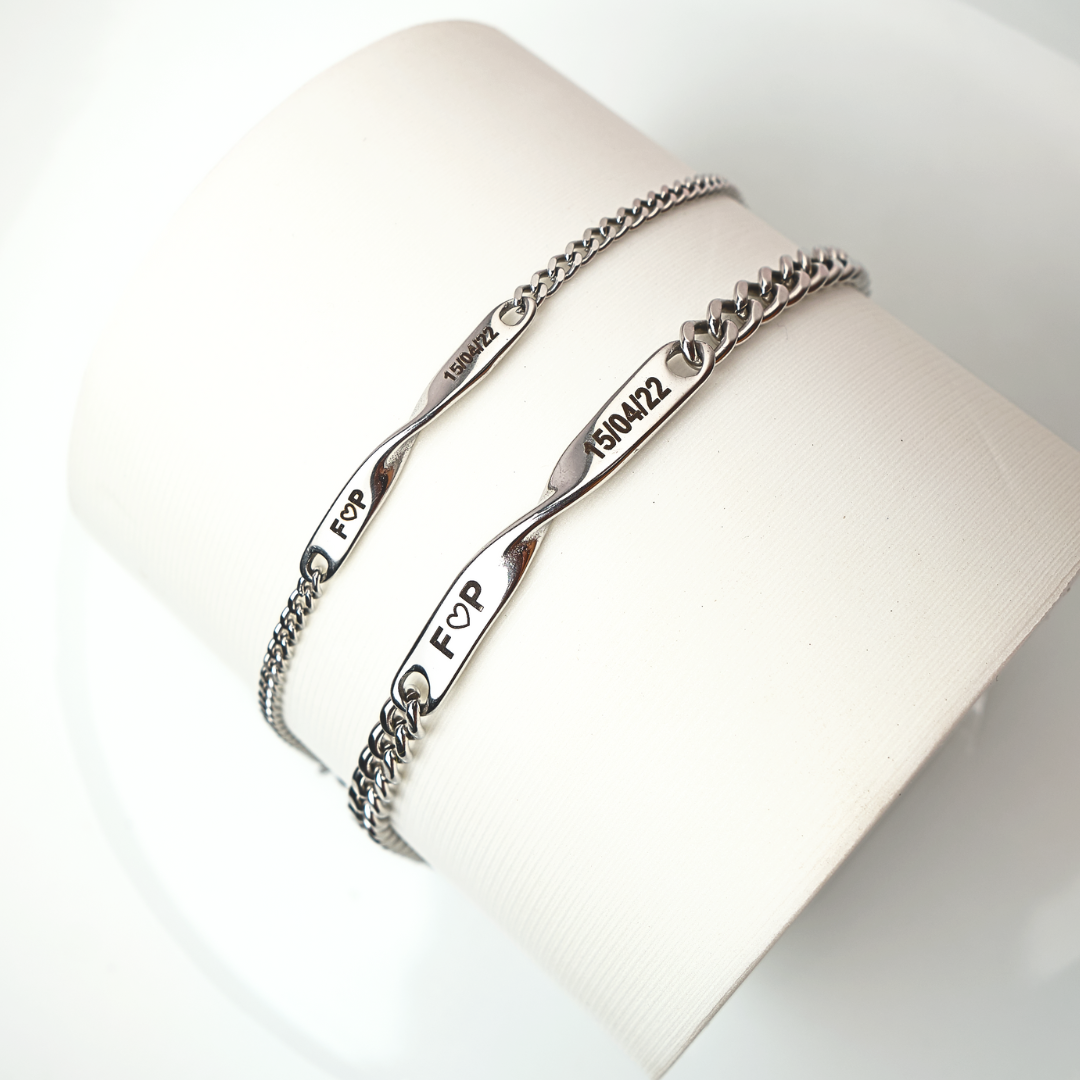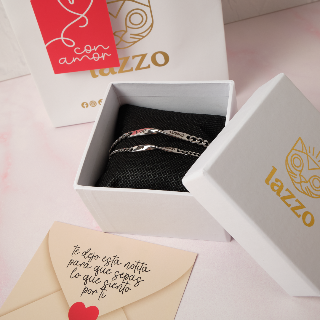 • Pulseras para pareja personalizadas de acero inoxidable, incluye grabado láser.