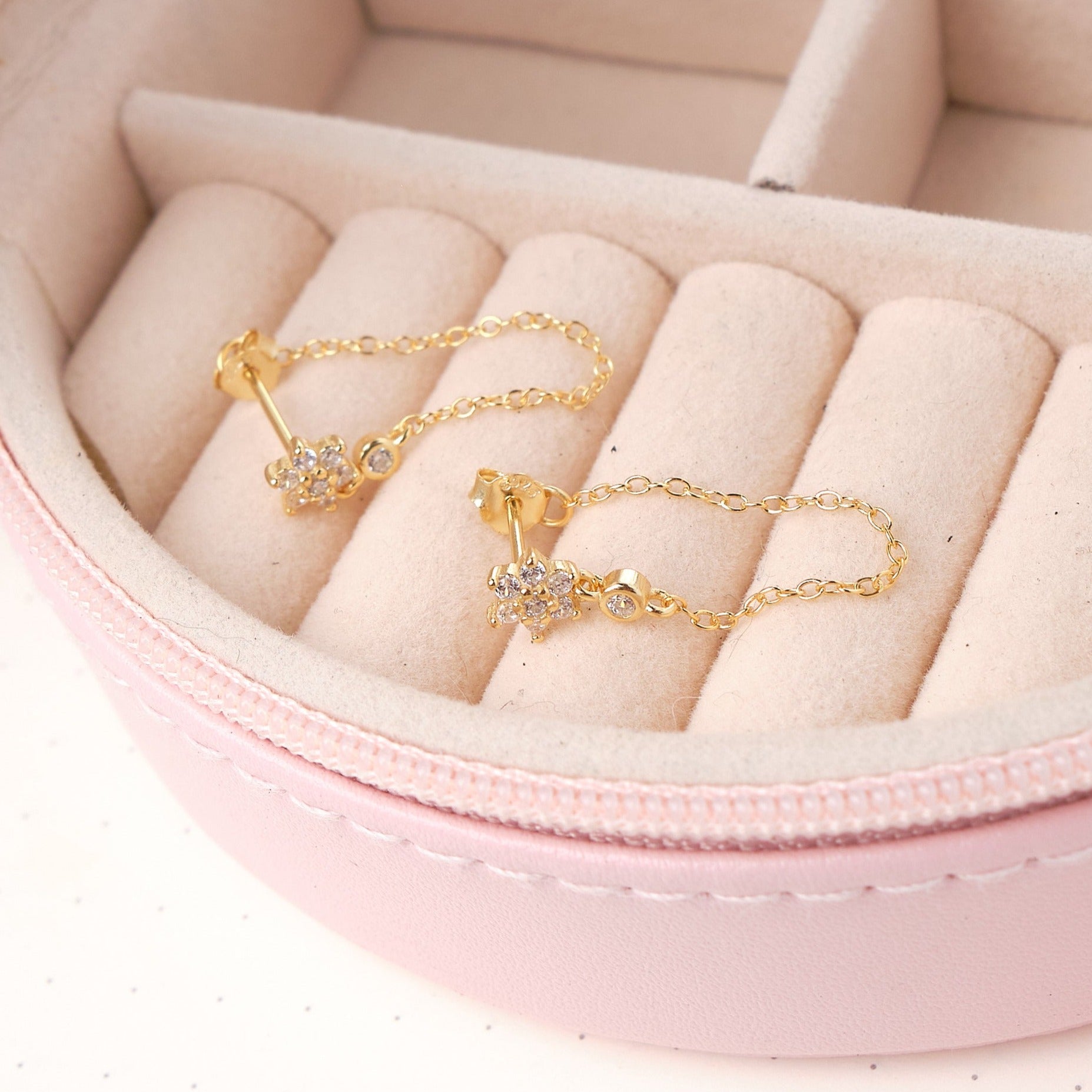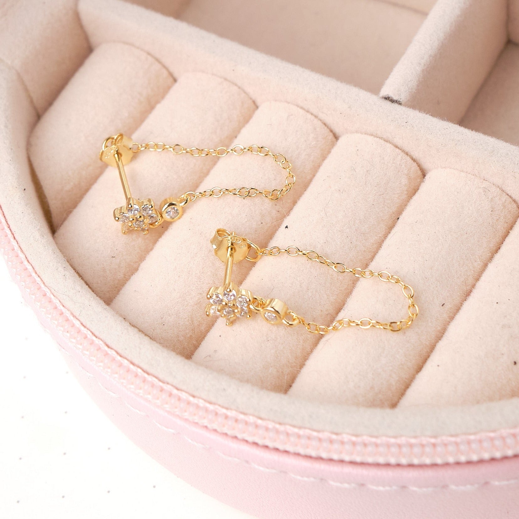 • Pendientes con cadena de plata, baño de oro y circonitas blancas.
