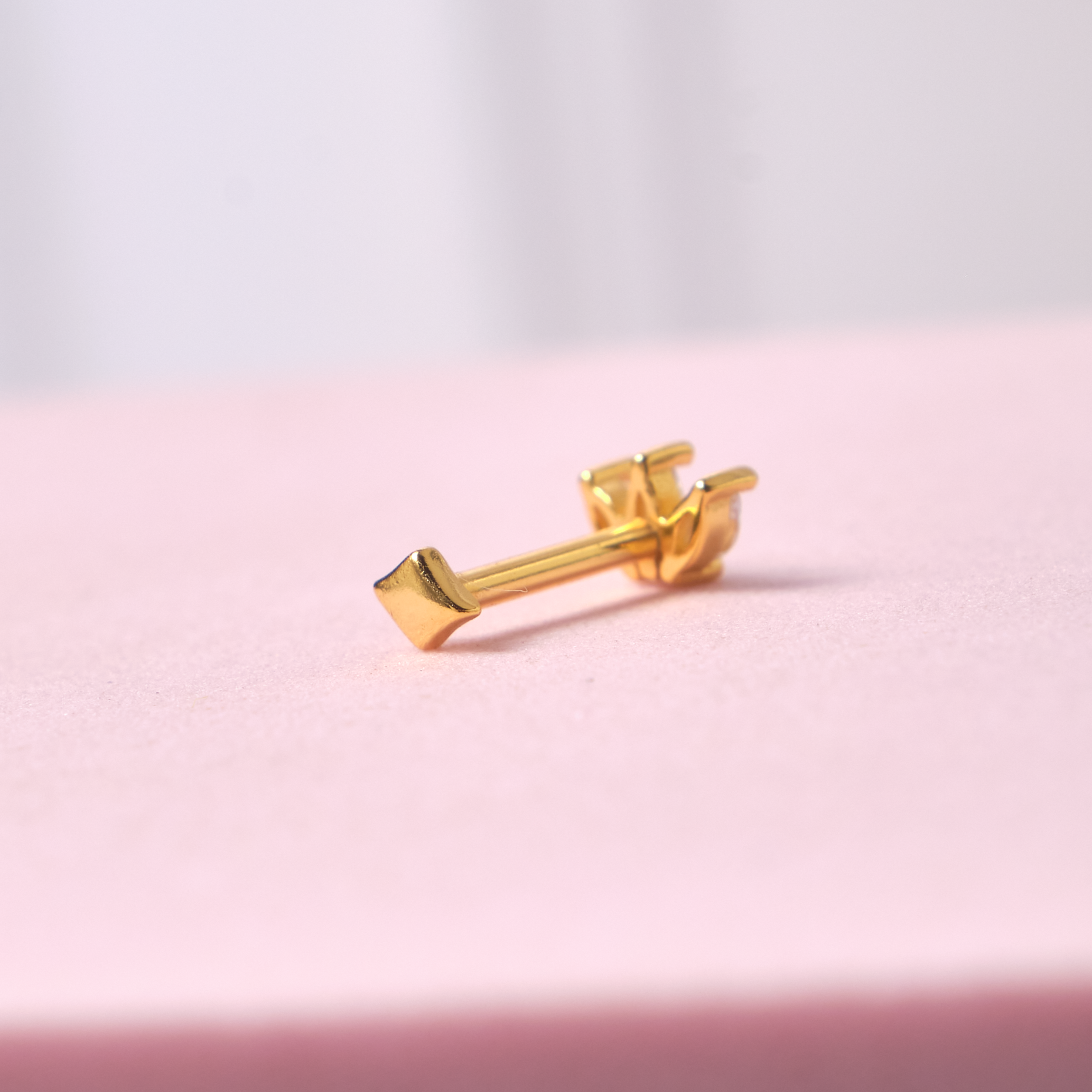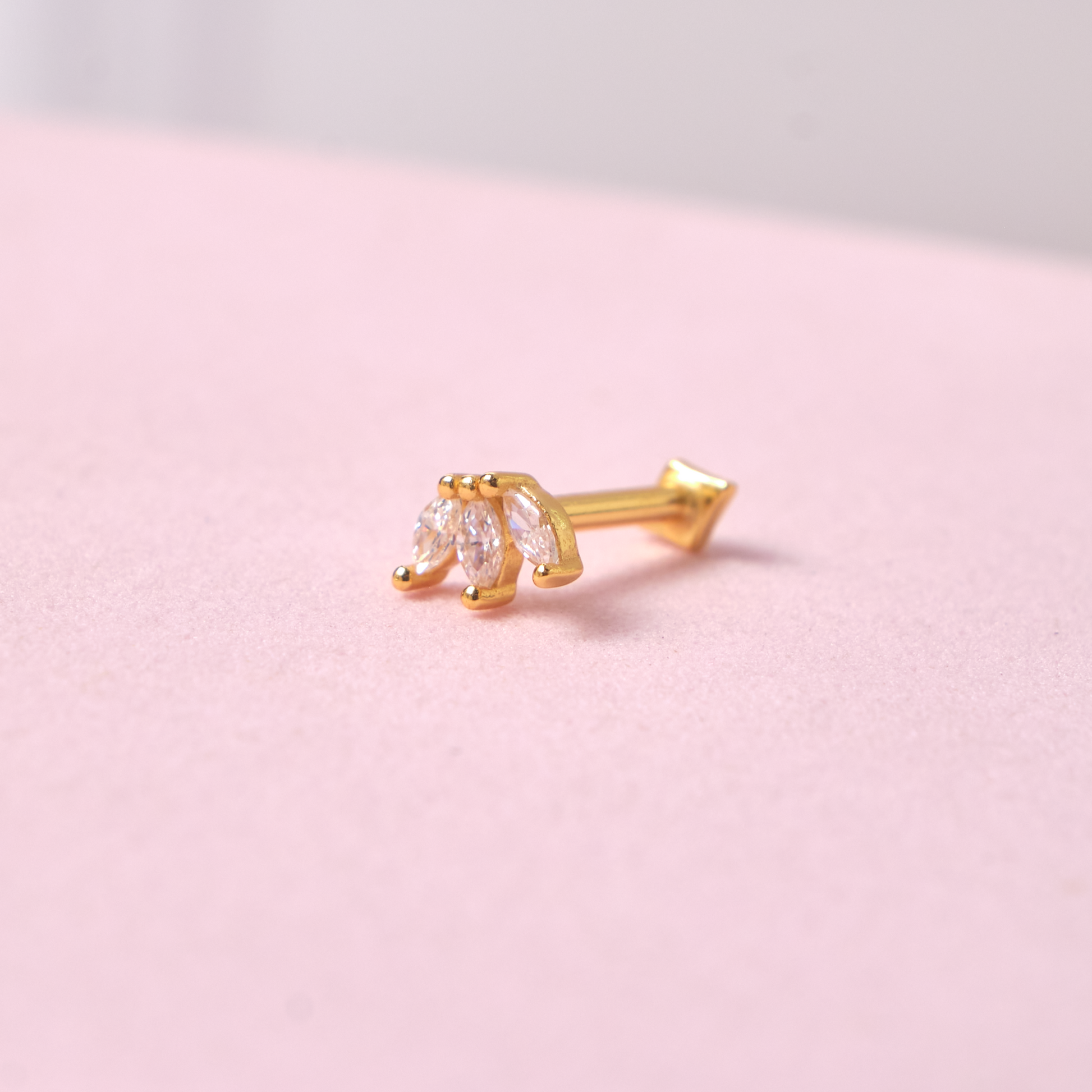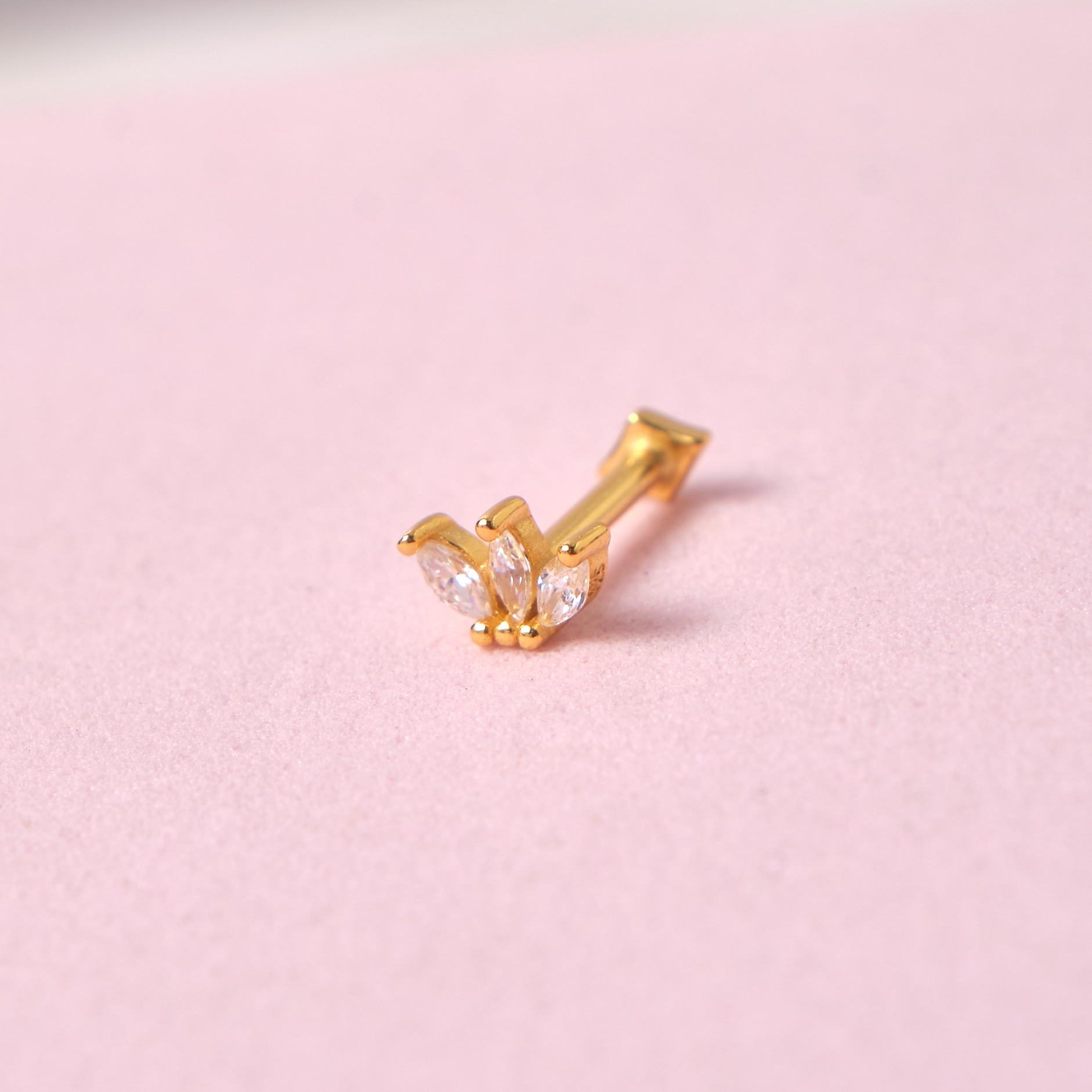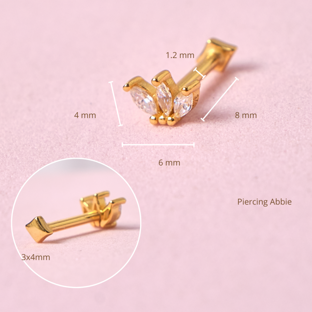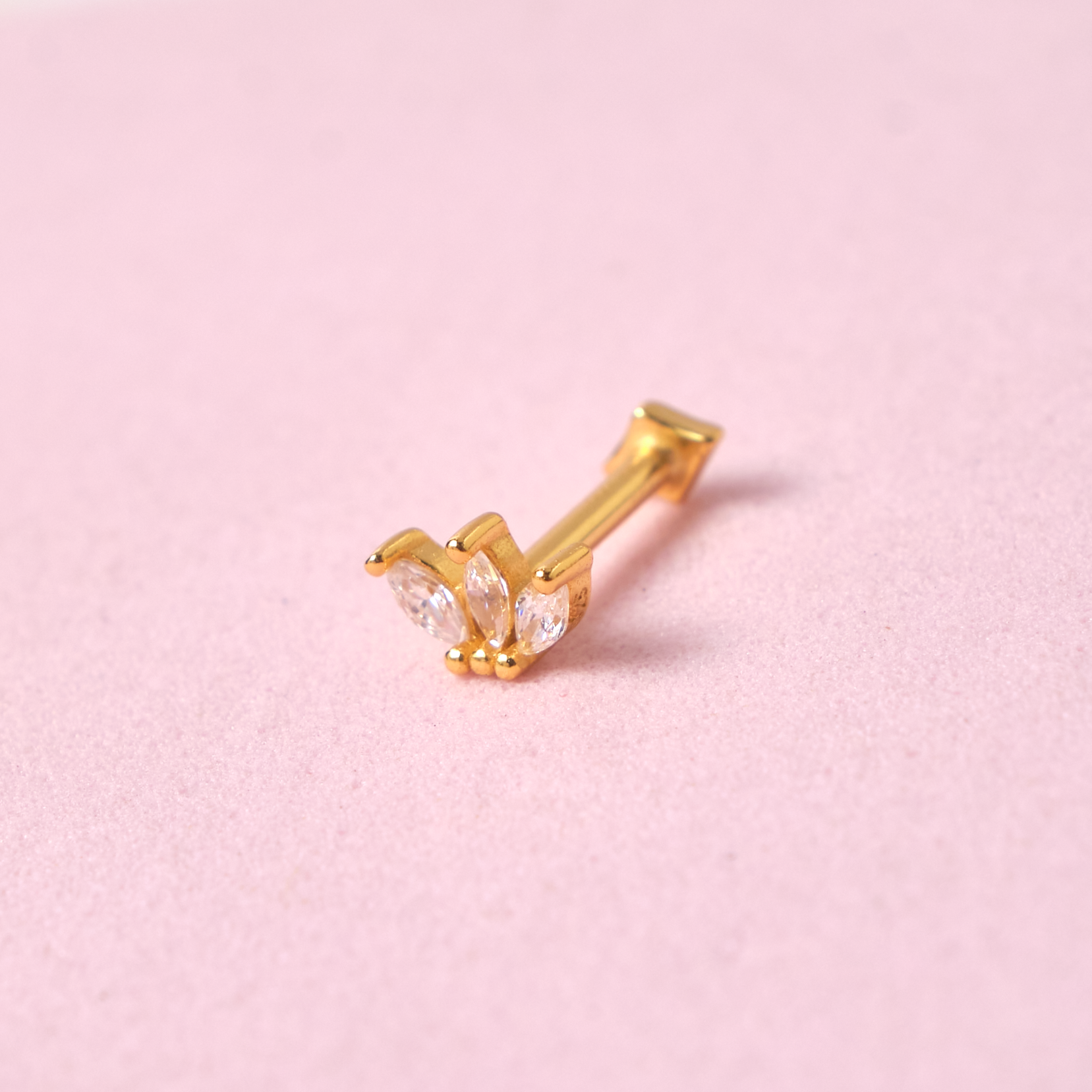 • Piercing para oreja de plata con baño en oro y pequeñas circonitas blancas.