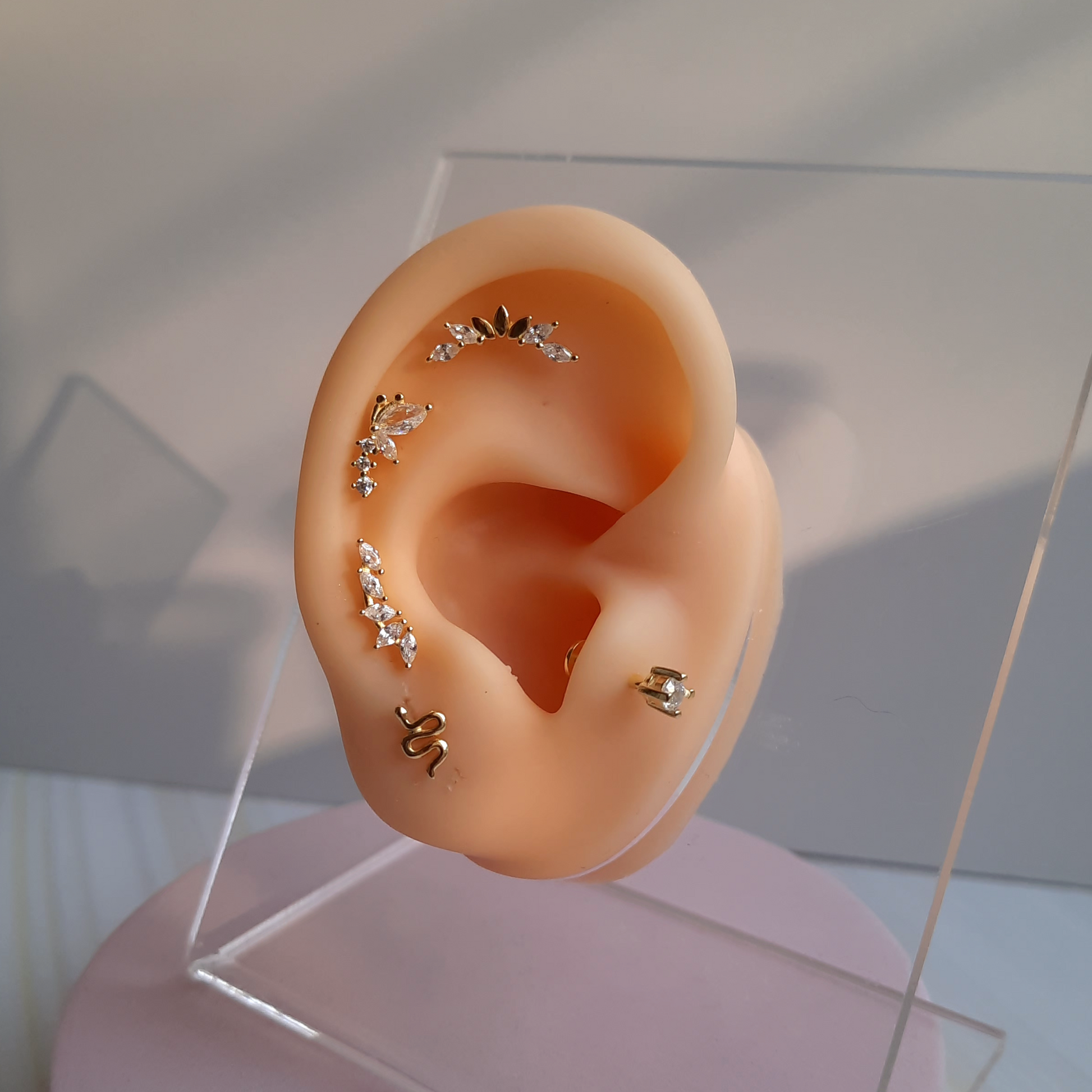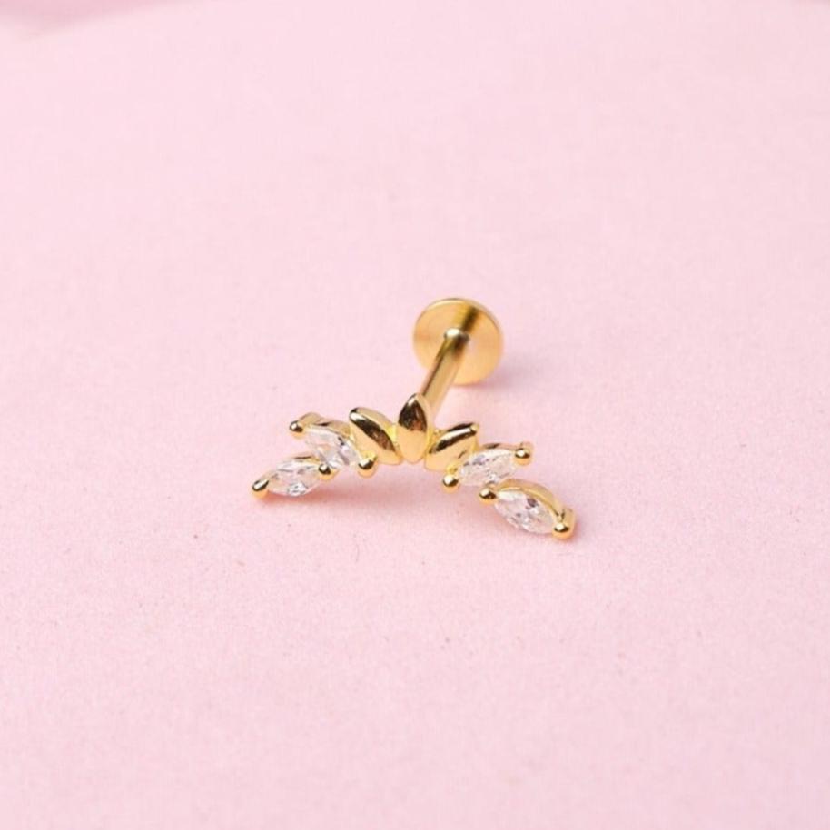 • Piercing para oreja de plata con baño en oro y circonitas blancas.