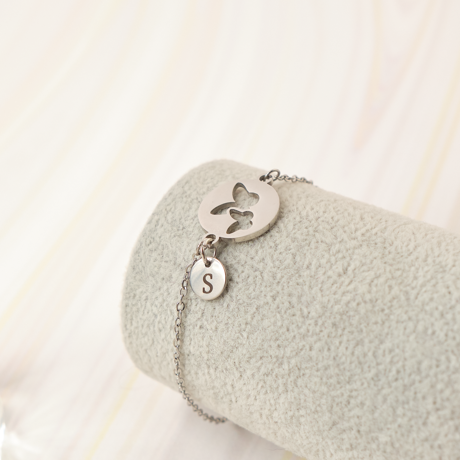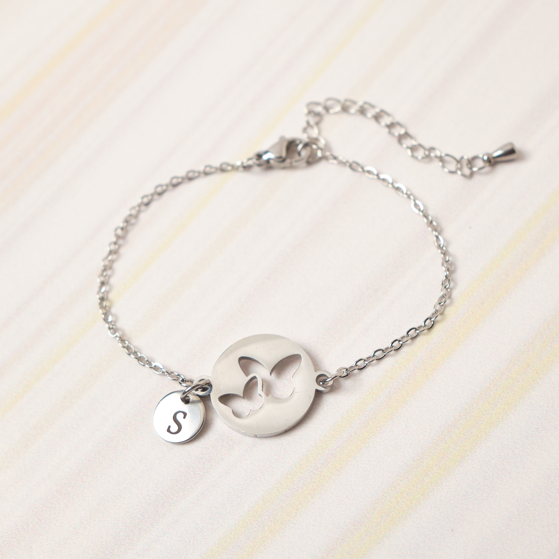 • Pulsera con dije de mariposas personalizada de acero inoxidable, incluye grabado láser de iniciales o nombres cortos.