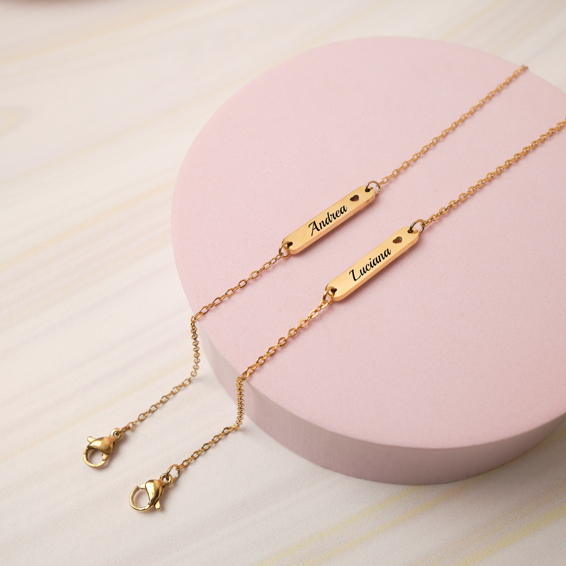 • Pulsera personalizada en acero inoxidable con tu nombre, fecha o símbolo favorito(Grabado láser por los dos lados de la pulsera). Perfecta para ti o para compartir con tu mejor amiga.