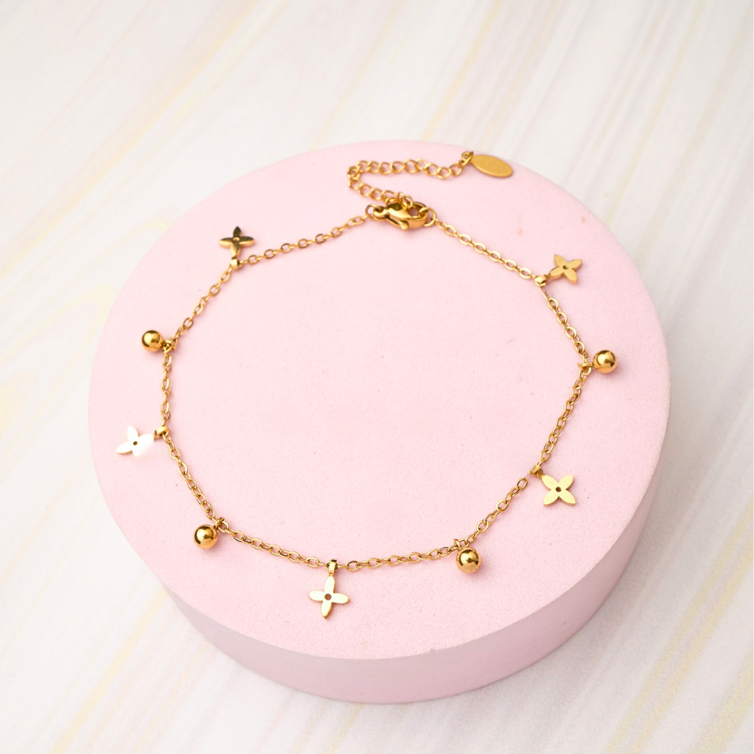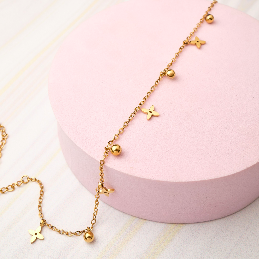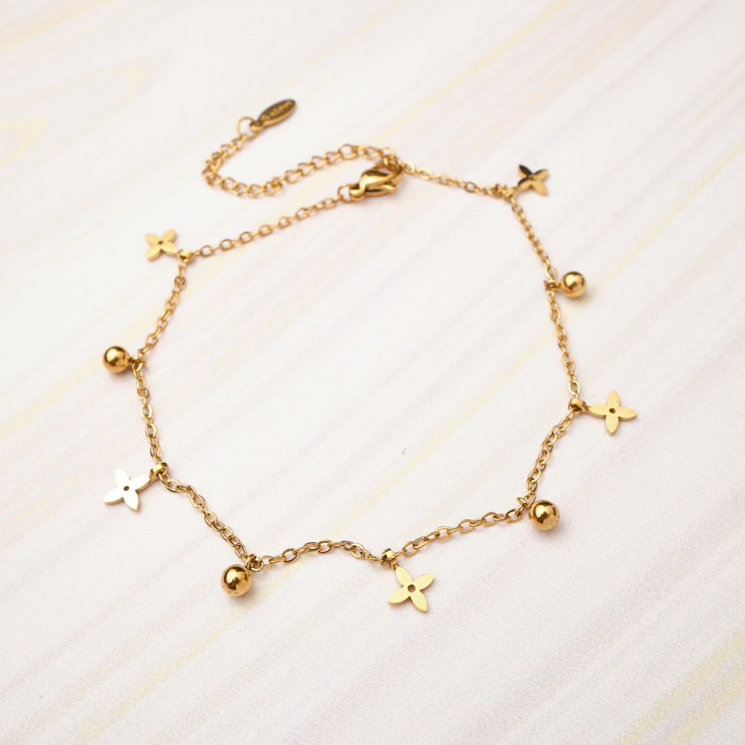 Tobillera de flores Waterproof en acero inoxidable 316L con chapa de oro 18k, una joya que destaca por su delicadeza y encanto. Las flores simbolizan alegría, crecimiento y feminidad, convirtiéndola en el accesorio ideal para acompañarte todos los días y darle un toque fresco y dulce a tu estilo, incluso en verano.