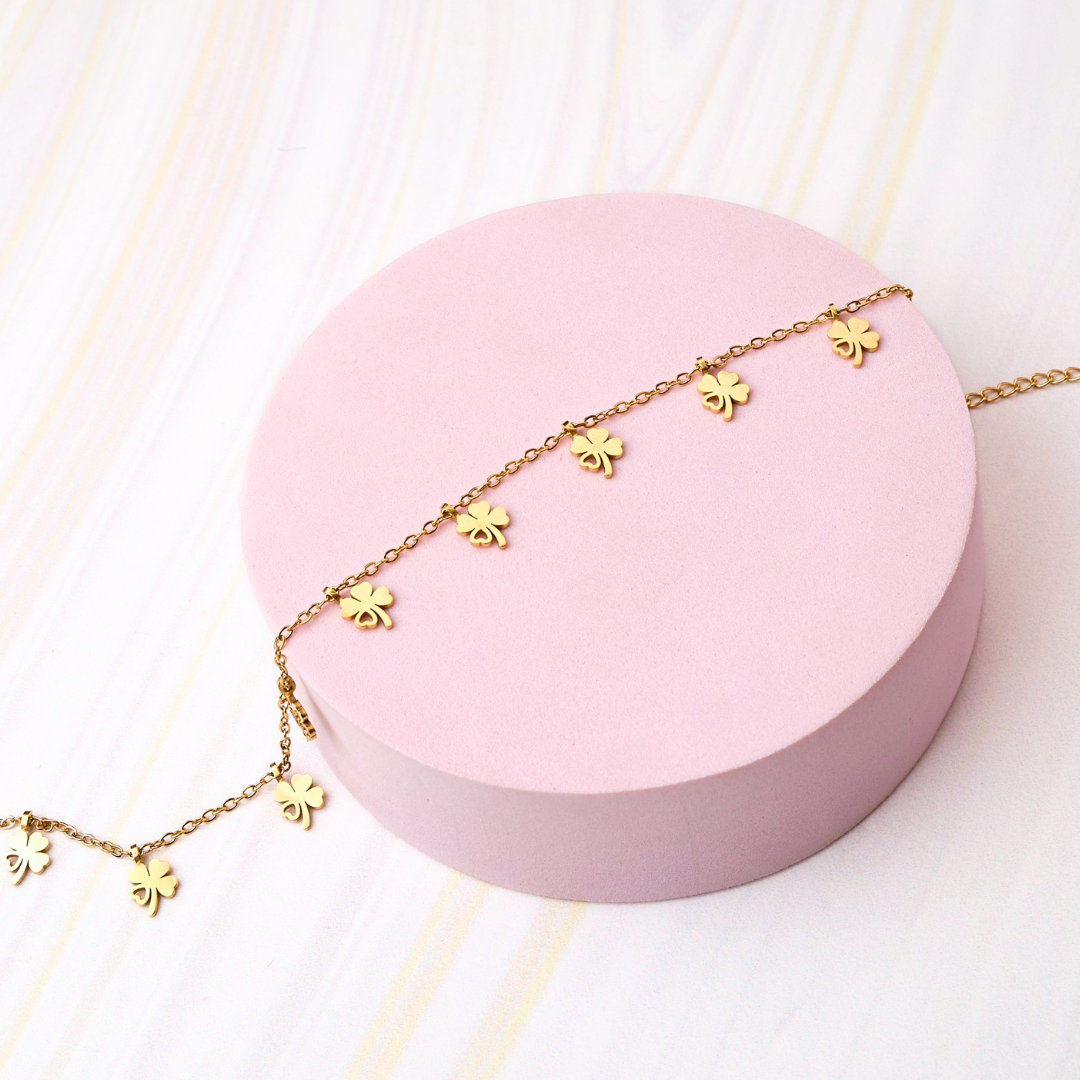 Tobillera de trébol Waterproof en acero inoxidable 316L con chapa de oro 18k, una pieza cargada de significado: el trébol es símbolo de suerte, esperanza y prosperidad. Un accesorio delicado y versátil que añadirá un toque especial a tu estilo, perfecto para acompañarte en tus días de verano o cualquier ocasión.